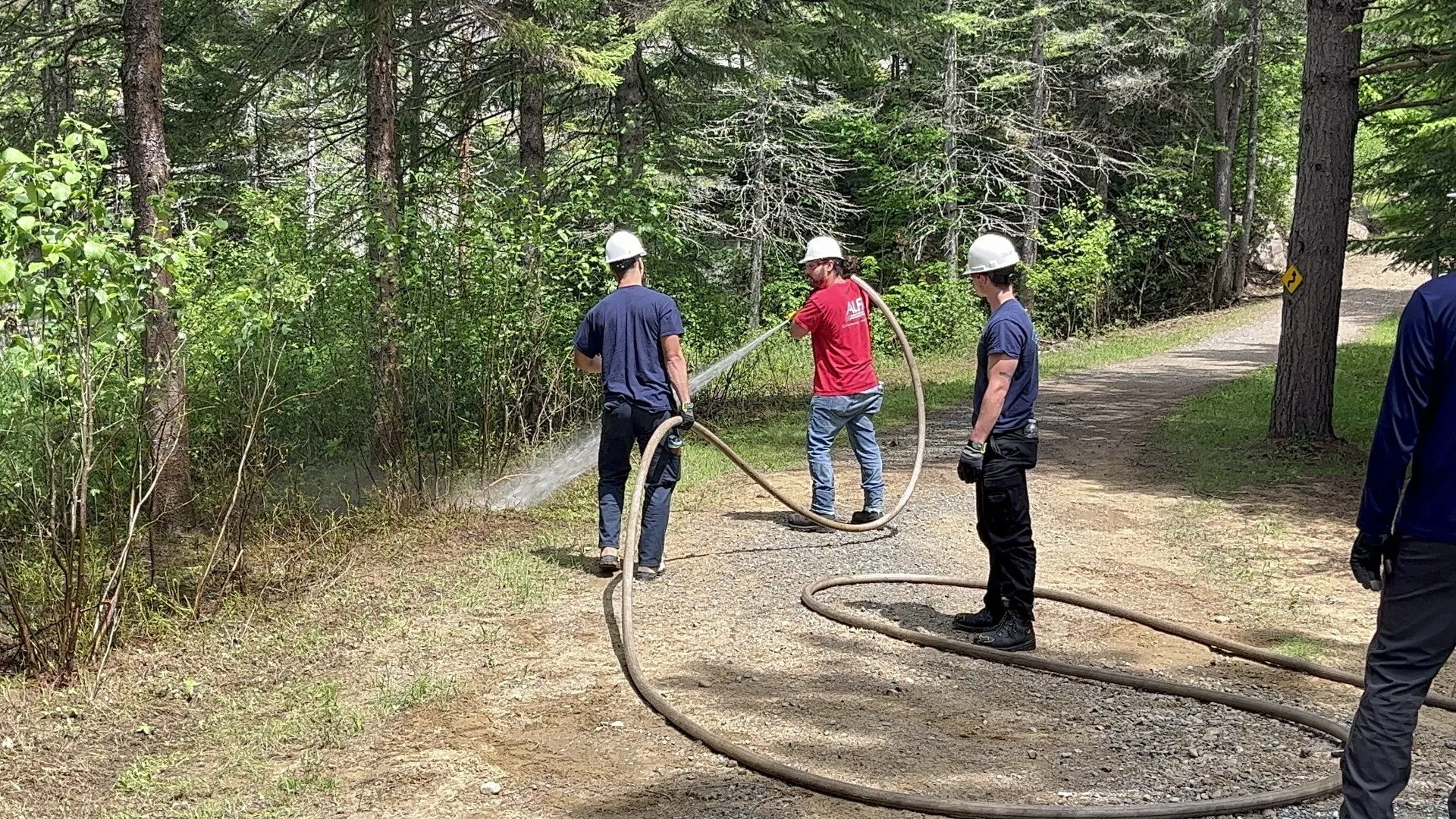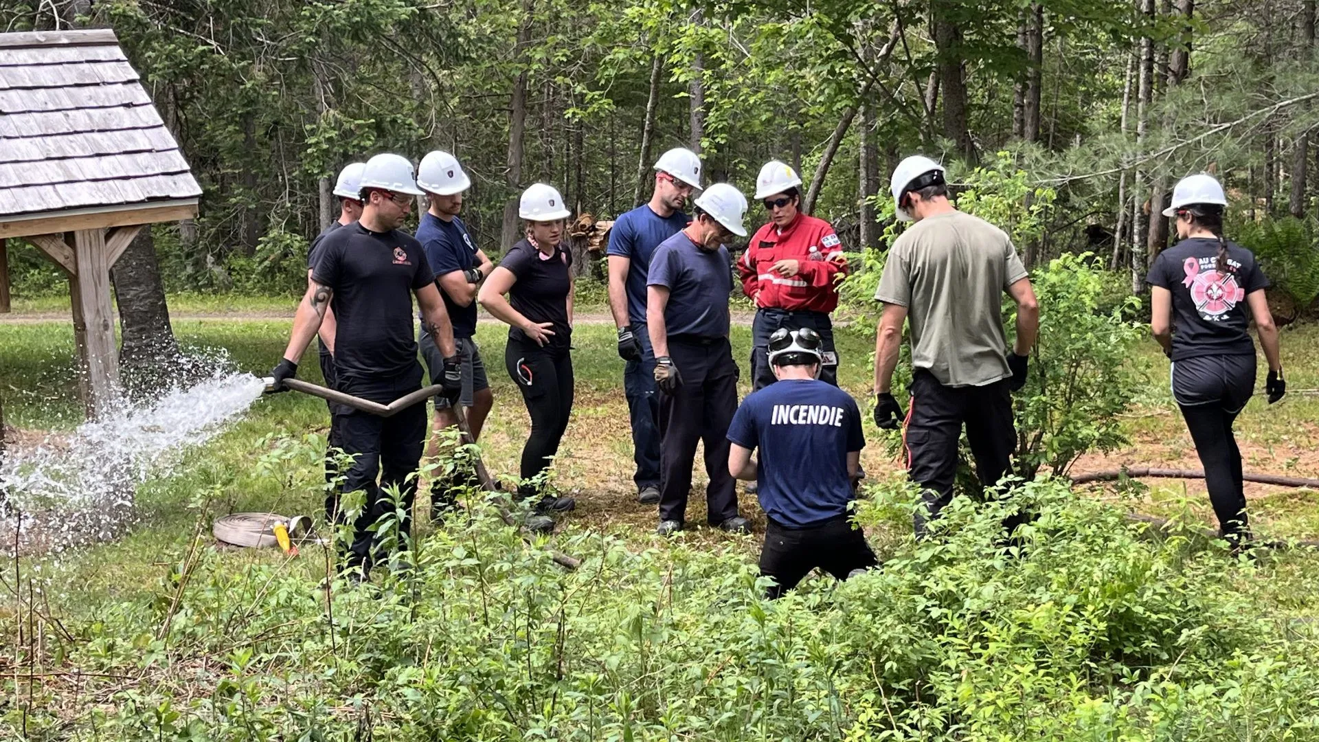Pendant un après-midi, les pompiers municipaux ont appris la tactique initiale qui permet de contenir un feu. Ils se sont exercés dans plusieurs secteurs du Domaine Saint-Bernard. (Photo L’info du Nord – Laureen Peers)