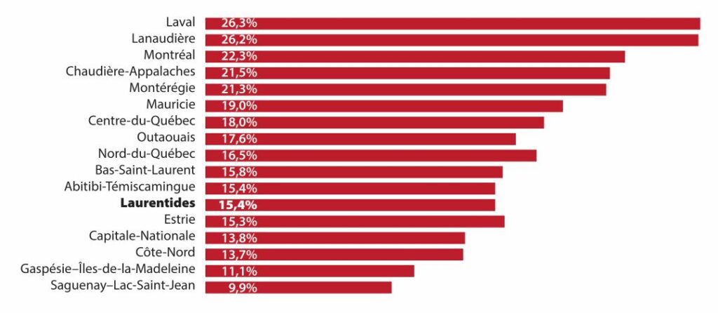 Ce sont les régions de Laval (26,3%) et de Lanaudière (26,2%) qui affichent des taux d’insécurité alimentaire les plus élevés. Parmi les 17 régions administratives, les Laurentides se situent au 12e rang (15,4%) à égalité avec l’Abitibi-Témiscamingue, L’Estrie affiche un taux similaire (15,3%). Seules les régions de la Capitale-Nationale, de la Côte-Nord, de la Gaspésie et du Saguenay-Lac-Saint-Jean font meilleure figure que les Laurentides.