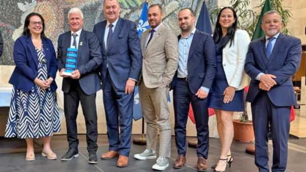 Le préfet de la MRC des Laurentides, Marc L’Heureux, tient la statuette du prochain territoire hôte, entouré d’autres membres de la délégation régionale. / Photo: Gracieuseté