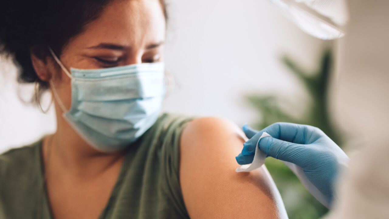 Woman wearing protective face mask getting vaccine shot at home. Female receiving covid vaccination by a healthcare worker at home.