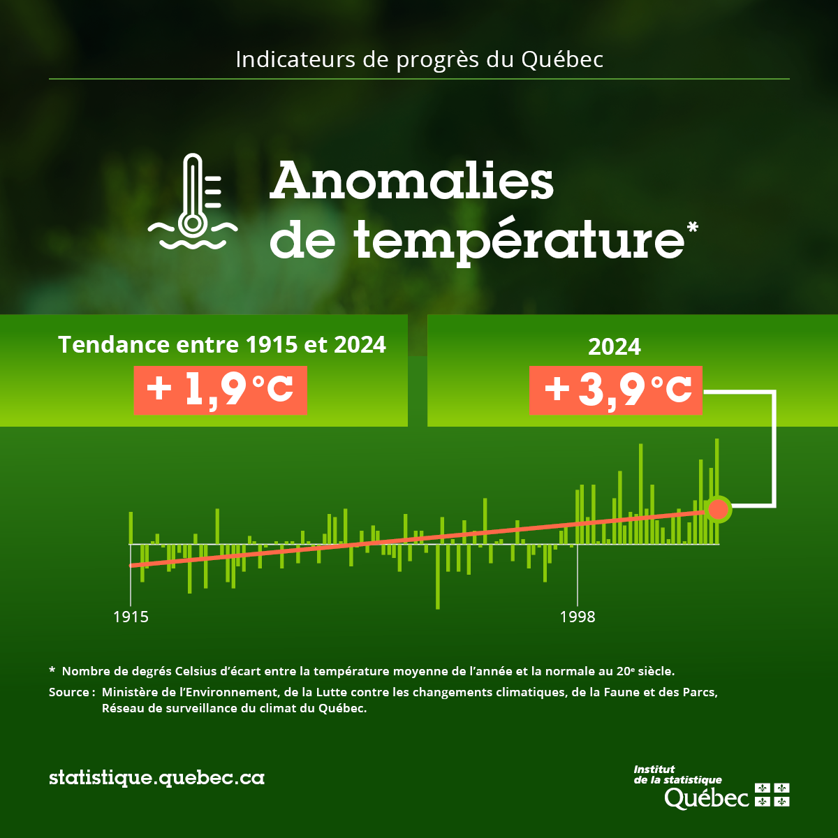 Les anomalies de température correspondent au nombre de degrés Celsius d’écart entre la température moyenne de l’année et la température normale au XX siècle. La tendance linéaire montre que les anomalies ont en moyenne augmenté de 1,9 °C.