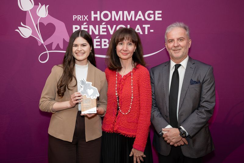 Alexanne Marcoux reçoit le prix Hommage bénévolat-Québec de la part de la sous-ministre de l’Emploi et de la Solidarité sociale, Annick Laberge, qui est accompagnée de Philippe Masson. / Photo: Frédéric Lavoie