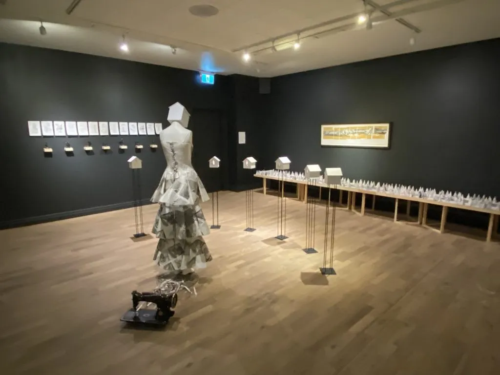 Une des pièces maîtresse de la collection est une œuvre qui a été réalisée avec la participation de femmes victimes de violence conjugale qui ont reçu les services des organismes la Citad’Elle et l’Ombre-Elle. « C’est une robe qui a été faite à partir des grands titres des journaux sur la violence faite aux femmes », explique l’article. Autour du mannequin qui porte le vêtement de papier se déploient 7 petites cabanes qui représentent les femmes qui ont collaboré avec l’artiste. « Ça illustre que l’on porte la violence depuis qu’on est né », évoque Suzanne FerlandL.