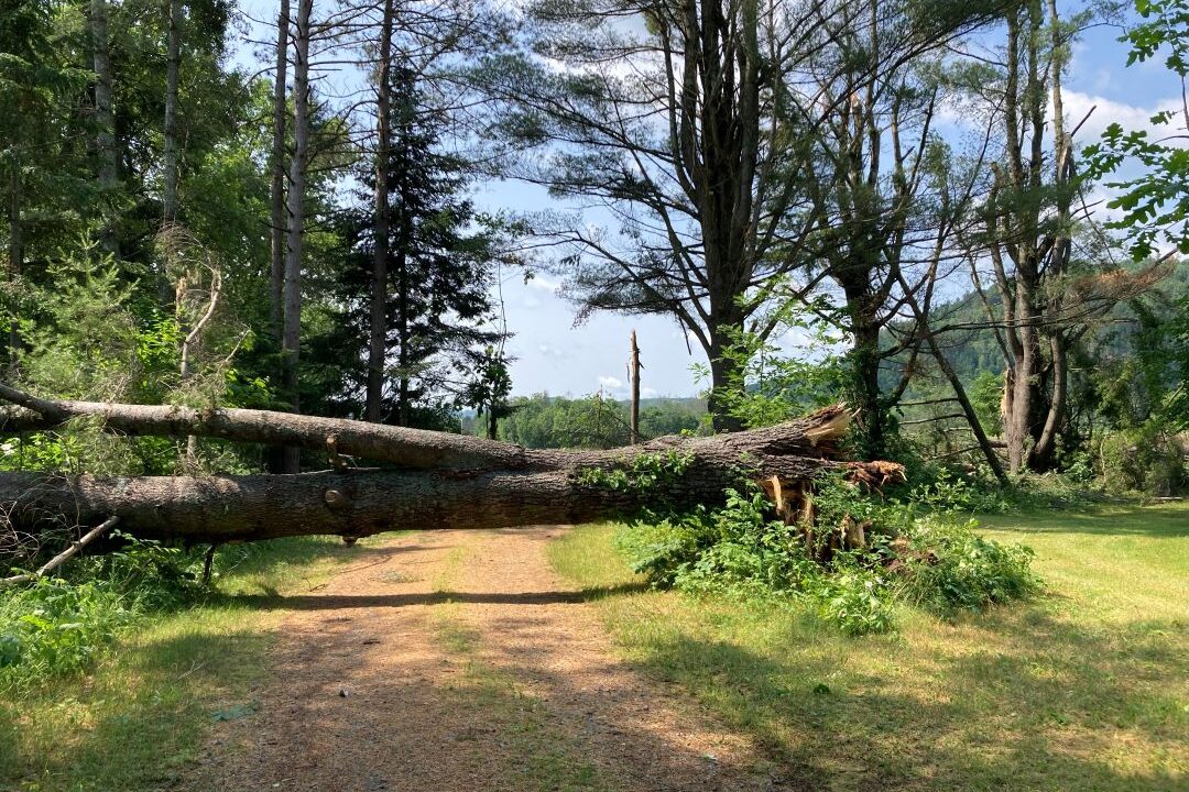 Deux cents arbres déracinés d’un coup, dont une dizaine qui est tombée dans la rivière Rouge qui borde le terrain de la fleuriste. Fort heureusement, les jardins matures où poussent pivoines et autres fleurs destinées à la vente aux fleuristes locaux n’ont pratiquement pas été touchés. De petits bâtiments et un tracteur et d’autres équipements ont été endommagés. Deux arbres sont tombés sur la résidence principale. Heureusement, il n’y a eu aucun blessé.