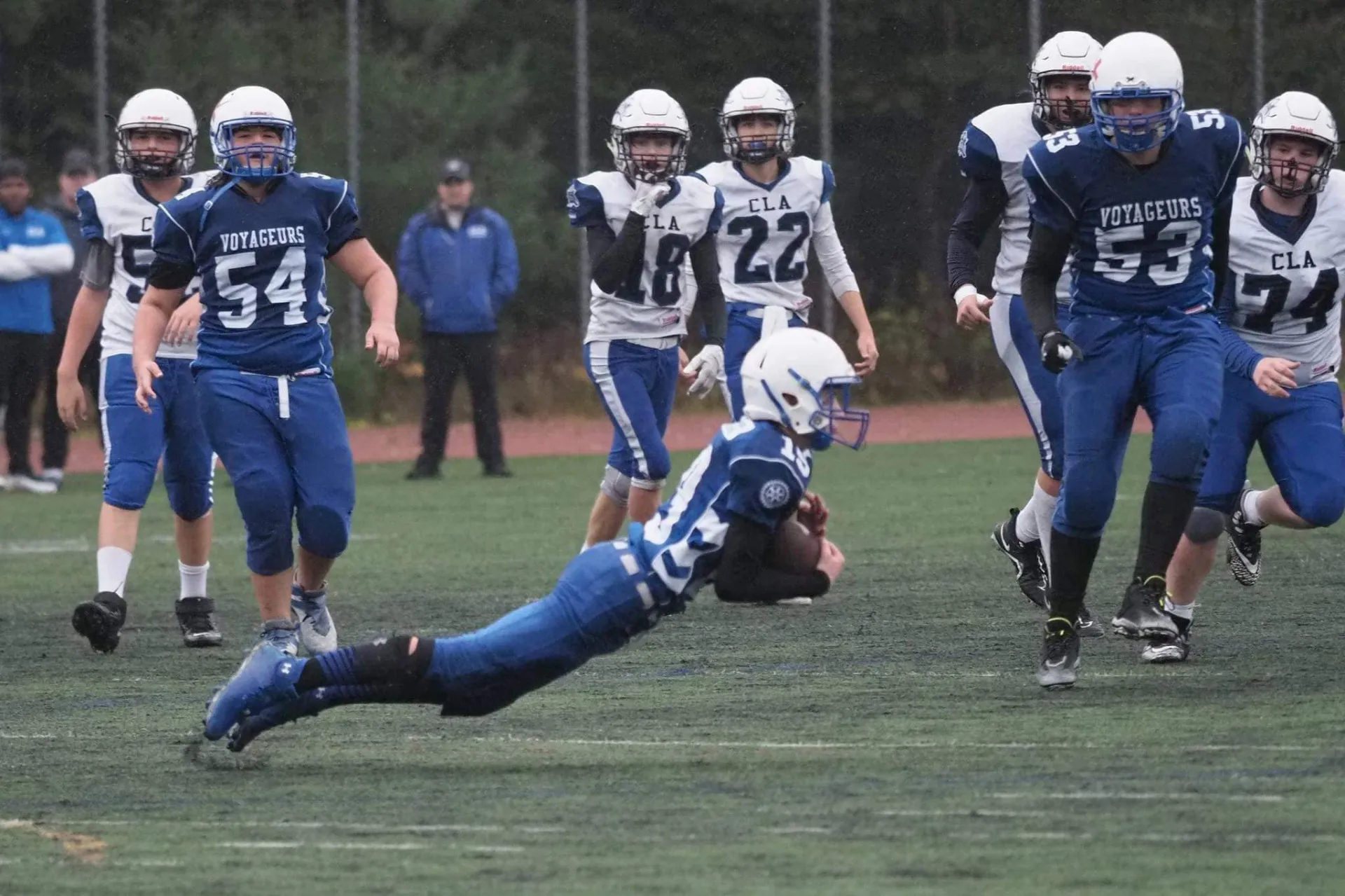 Forts de la 2e position au classement du RSEQ pendant la saison, les Voyageurs cadets affrontaient cette fin de semaine la dernière équipe au classement, les Sphinx de l’Assomption. Pour l’occasion, nos joueurs revêtaient l’uniforme bleu pour la première fois en quatre ans. Signe d’une équipe en feu de ses cinq victoires consécutives? Le système d’incendie de l’école Curé-Mercure retentit alors que les deux équipes étaient en train de se changer dans l’école. Une fois les pompiers passés pour confirmer que tout était sécuritaire, les deux équipes purent continuer leur préparation de match dans l’école. On s’attendait à un duel inégal entre la formation tremblantoise et les visiteurs. Cependant, le message passé aux joueurs était clair. L’Assomption allait jouer avec l’énergie du désespoir et ils respectaient notre formation. Nous devions avoir le même respect pour eux pour éviter les pièges. Sous la pluie de samedi, nous savions qu’il y aurait des revirements dans le match. Un ballon mouillé est synonyme d’échappés et de changement de possession au football.
